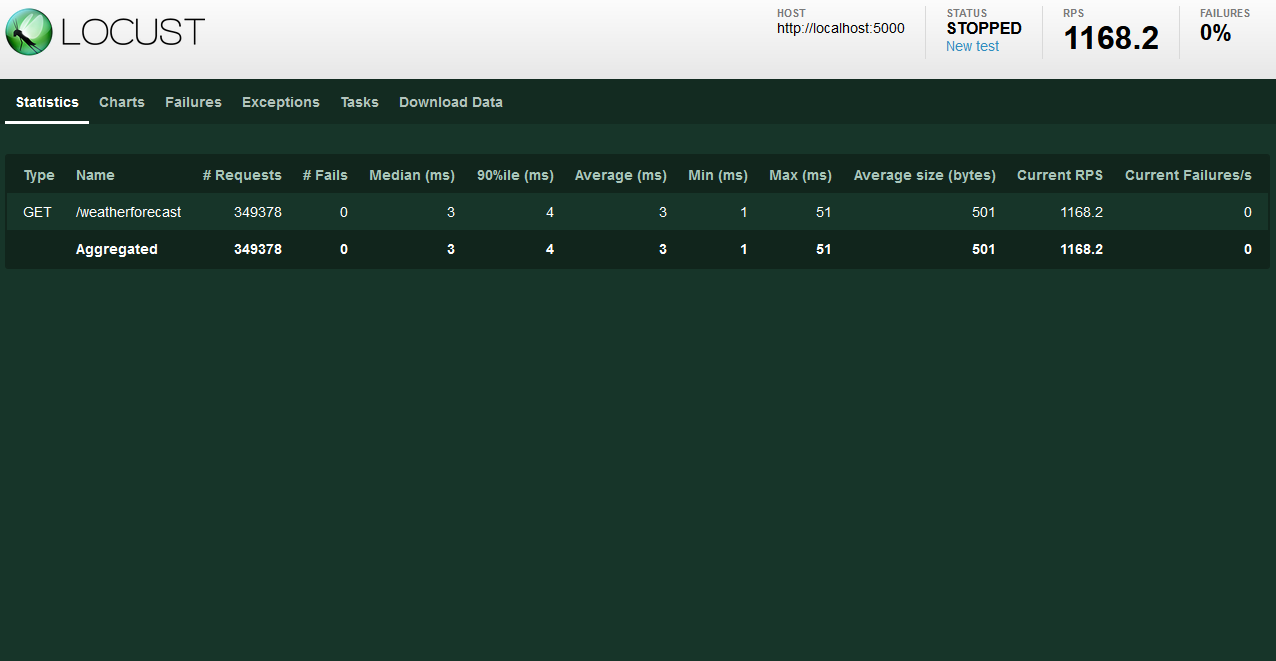 For starting load test you need to execute command line below from locust_first_test.py file located which we wrote above and you should see something like below